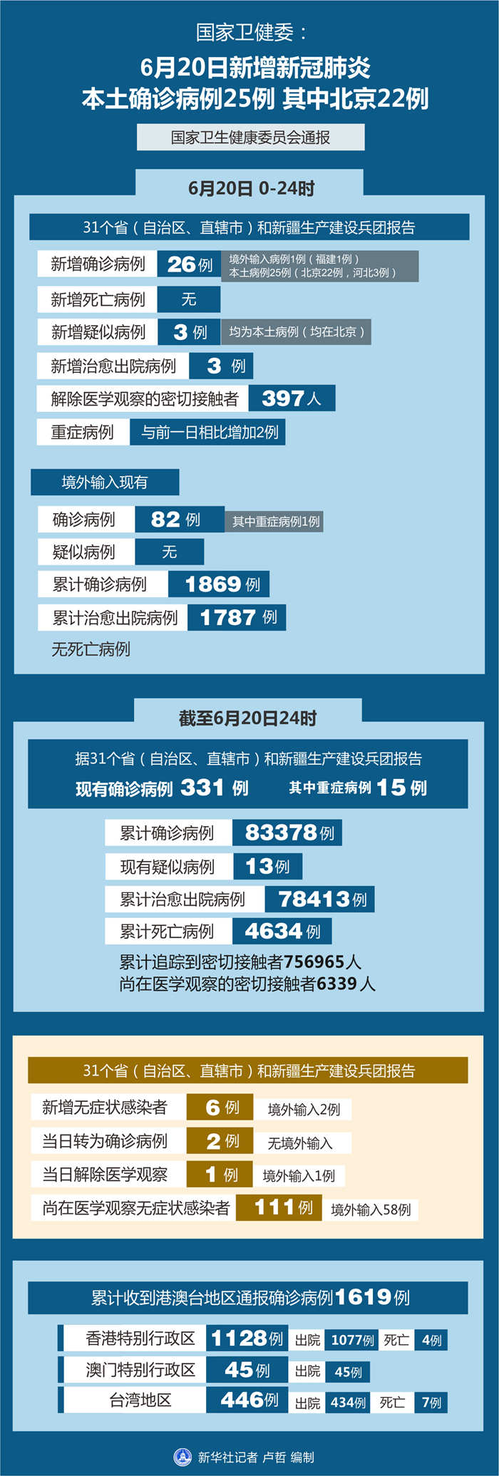 新華社北京6月21日電(記者陳聰)據(jù)國(guó)家衛(wèi)生健康委員會(huì)21日通報(bào),6月20日0—24時(shí),31個(gè)省(自治區(qū)、直轄市)和新疆生產(chǎn)建設(shè)兵團(tuán)報(bào)告新增新冠肺炎確診病例26例,其中境外輸入病例1例(在福建),本土病例25例(北京22例,河北3例);無新增死亡病例;新增疑似病例3例,均為本土病例(均在北京)。