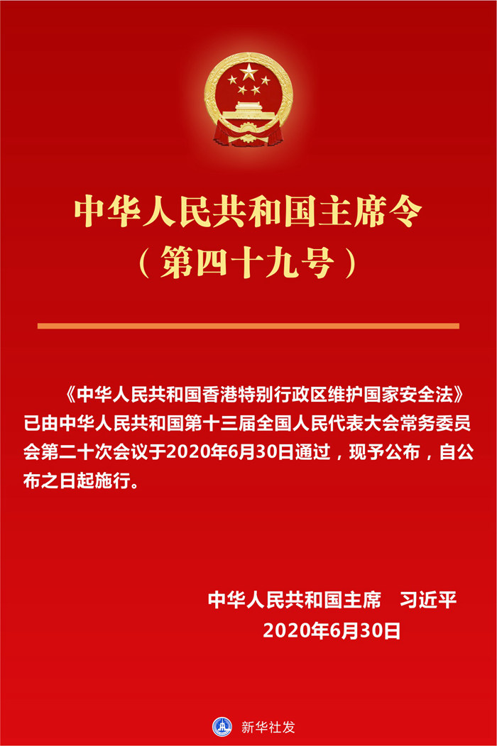《中華人民共和國香港特別行政區(qū)維護國家安全法》已由中華人民共和國第十三屆全國人民代表大會常務(wù)委員會第二十次會議于2020年6月30日通過,現(xiàn)予公布,自公布之日起施行。
