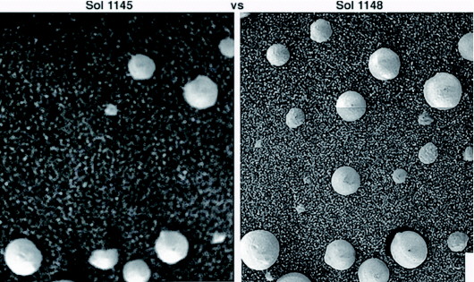在巖層頂部的這些“生命”是集體定向的,帽子和莖向上傾斜,像沖著某個光源進行光合作用。此外,“機遇號”還拍到了在無風情況下,12個球形“生命”冒出土壤,另外11個“生命”在三天內(nèi)明顯長大的照片。