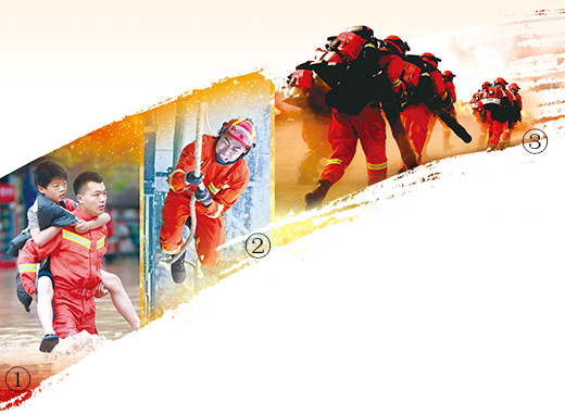 圖①:今年6月底,受暴雨影響,重慶市龍潭河沿線地區被淹。圖為消防隊員踏水背出受困群眾。肖樂峰攝(人民視覺) 圖②:在山東省煙臺市消防救援支隊培訓基地,消防隊員正在參加繩索攀爬比賽。孫文潭攝(人民視覺) 圖③:今年5月,甘肅省森林消防總隊張掖支隊開展了實戰滅火演練。圖為消防隊員奔赴演練火場。張小軍攝(人民視覺)