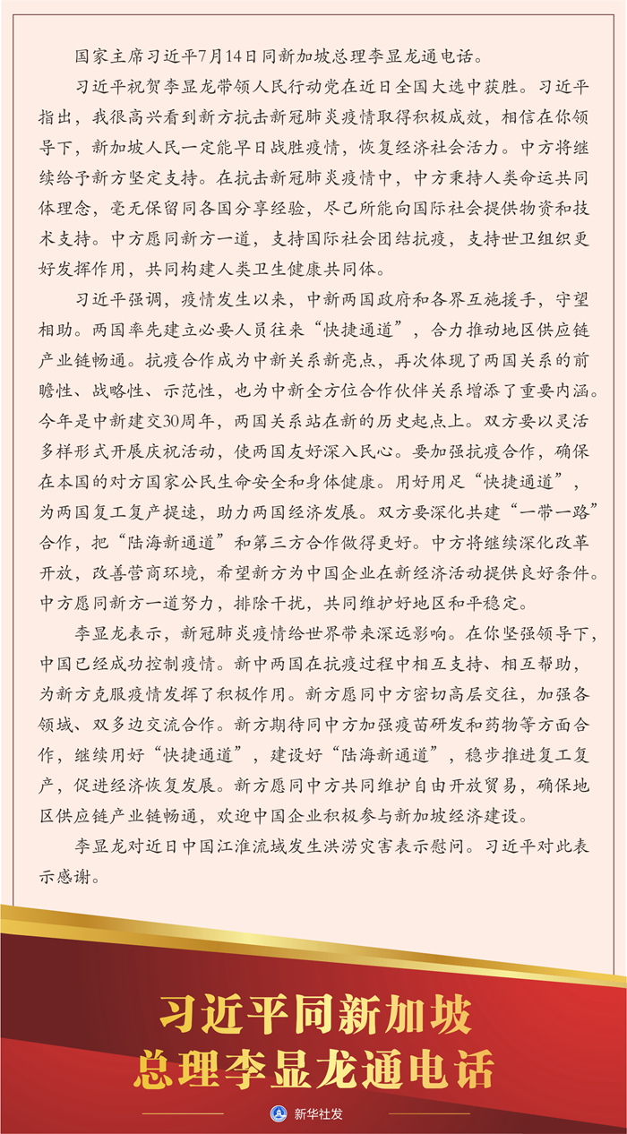 新華社北京7月14日電 國家主席習近平7月14日同新加坡總理李顯龍通電話。