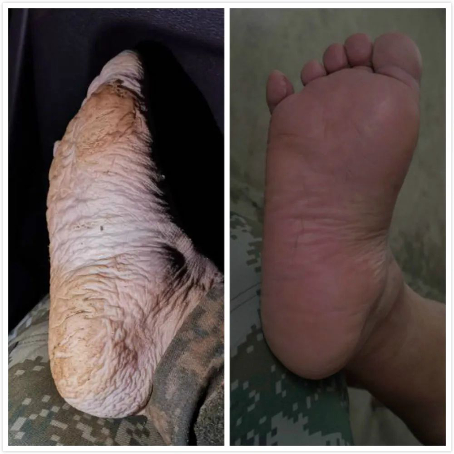 東至縣人武部部長南小勇回憶,在回來的路上,由于大家身上的衣服都沾滿了泥漿,眾人就把衣服脫了下來坐車返回。大家的目光一下子就集中在陳壽春的腳上,南小勇拍下了照片,發到了工作群里,引發第一波“心疼”。