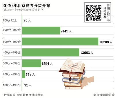 同時,北京教育考試院官網(wǎng)公布了2020年北京市高考考生分數(shù)分布。其中,700分以上80人,600分至699分區(qū)間共9142人。