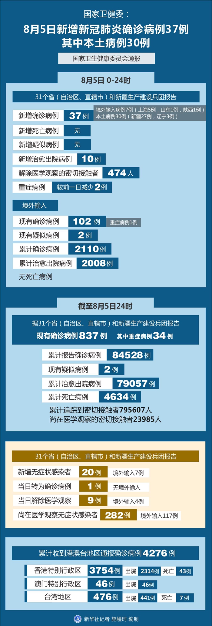 截至8月5日24時,據(jù)31個省(自治區(qū)、直轄市)和新疆生產(chǎn)建設(shè)兵團(tuán)報告,現(xiàn)有確診病例837例(其中重癥病例34例),累計治愈出院病例79057例,累計死亡病例4634例,累計報告確診病例84528例,現(xiàn)有疑似病例2例。累計追蹤到密切接觸者795607人,尚在醫(yī)學(xué)觀察的密切接觸者23985人。