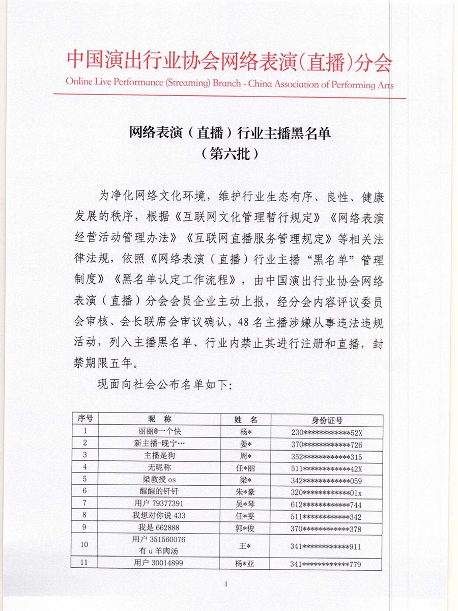根據《互聯網文化管理暫行規定》《網絡表演經營活動管理辦法》《互聯網直播服務管理規定》等相關法律法規,按照《網絡表演(直播)行業主播“黑名單”管理制度》《黑名單認定工作流程》規定,中國演出行業協會網絡表演(直播)分會現向社會公布第六批主播黑名單,被列入黑名單的主播將在行業內禁止注冊和直播,封禁期限5年。(總臺央視記者 曹巖)