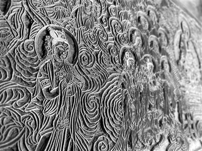 隨著白富鋼的五指輕盈地在古老的木板上游走,一塊木質(zhì)經(jīng)板上縱橫的紋理逐漸明晰起來。這批經(jīng)板始刻于清雍正十一年(公元1733年),完成于清乾隆三年(公元1738年),是我國漢文大藏經(jīng)卷帙中收錄最豐富,也是最后一部官方雕印本。經(jīng)板共計79036塊,總重達400噸。堪稱我國木板經(jīng)書之最。