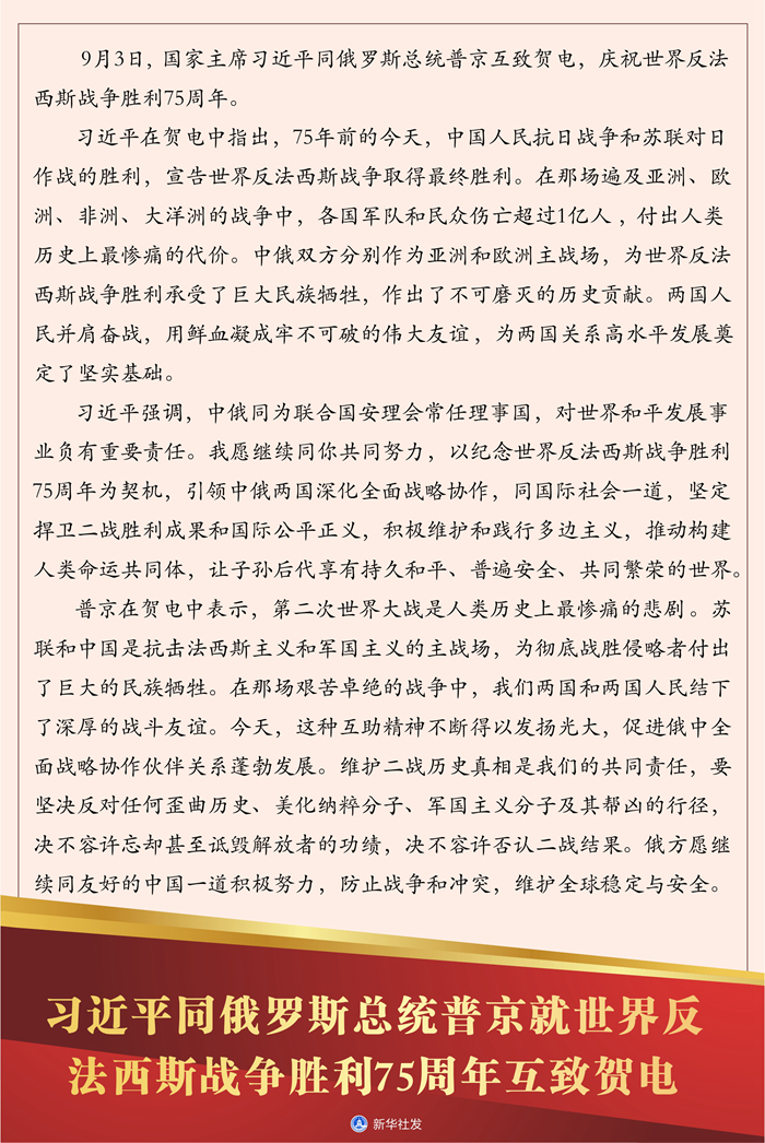 新華社北京9月3日電 國家主席習近平3日同俄羅斯總統普京互致賀電,慶祝世界反法西斯戰爭勝利75周年。