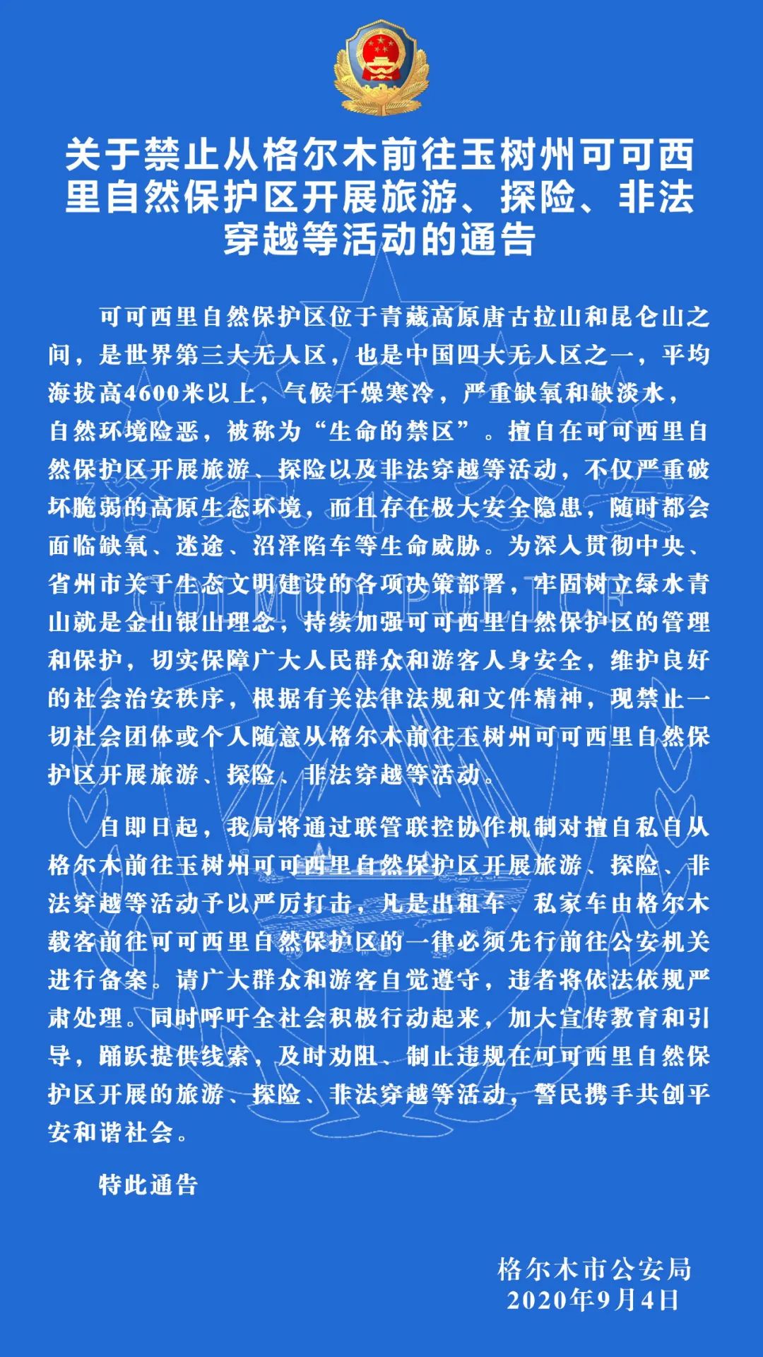據格爾木公安微信公眾號消息,9月4日,青海省格爾木市公安局發布通告,禁止一切社會團體或個人隨意從格爾木前往玉樹州可可西里自然保護區開展旅游、探險、非法穿越等活動,即日起將對上述行為予以嚴厲打擊,凡是出租車、私家車由格爾木載客前往可可西里自然保護區的一律必須先行前往公安機關進行備案。