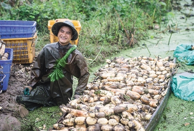 蓮藕是湖北省重要的特色農產品。吳祺經歷了蓮藕畝產從不足1000公斤到2000多公斤的跨越,也見證了從幾毛錢一公斤鮮藕到1元錢一小袋蓮藕制成品零食的增值。“這些影響賣相的‘邊角料’也有用,可以加工成藕粉。”他拿起幾節被掰掉的藕頭說。