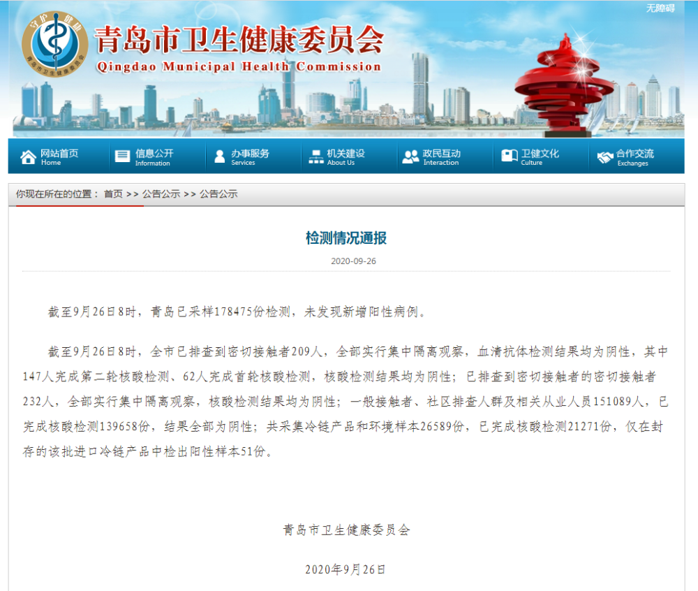 截至9月26日8時(shí),青島已采樣178475份檢測(cè),未發(fā)現(xiàn)新增陽性病例。