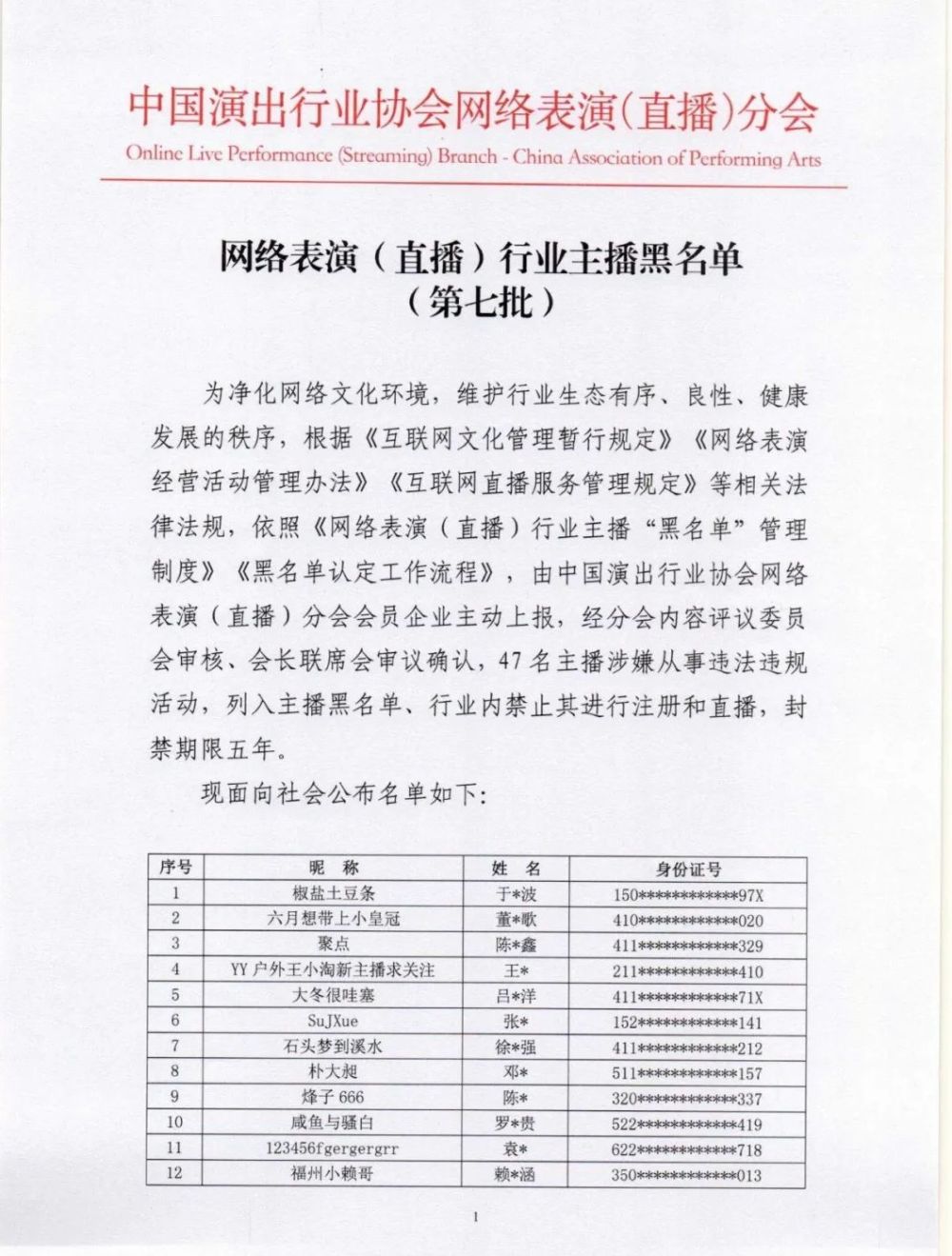 中國演出行業協會網絡表演(直播)分會向社會公布第七批主播黑名單,47名主播涉嫌從事違法違規活動,列入主播黑名單。