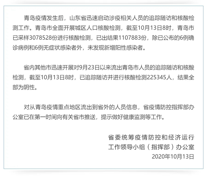 山東省迅速開展青島疫情相關(guān)人員追蹤隨訪和核酸檢測(cè)工作