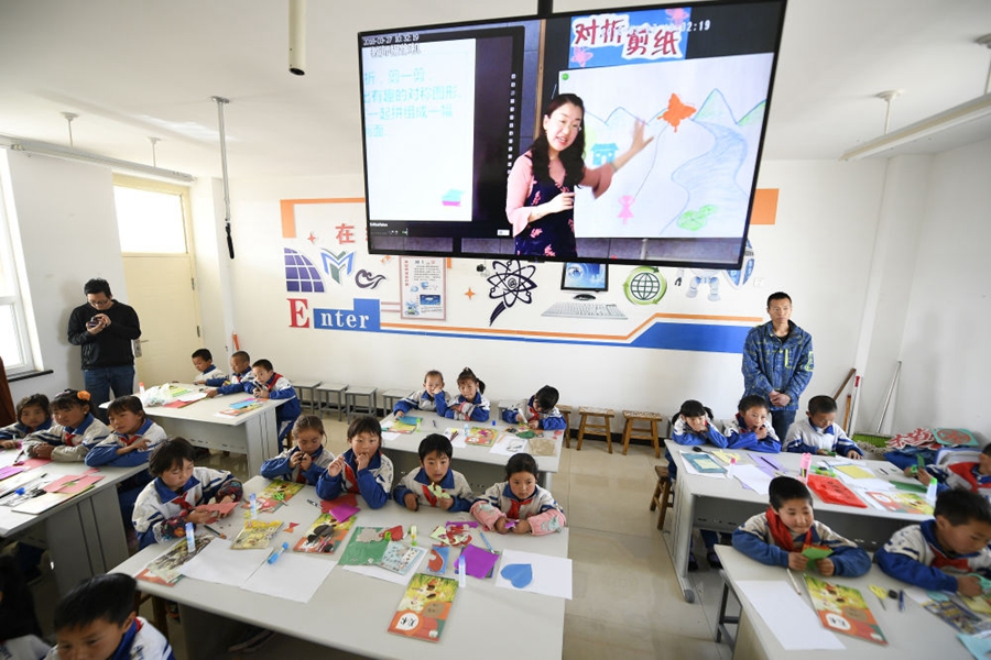 移民區的孩子在中衛市中寧縣寬口井中石油希望學校“在線課堂”上課(2018年3月27日攝)。新華社記者 王鵬 攝