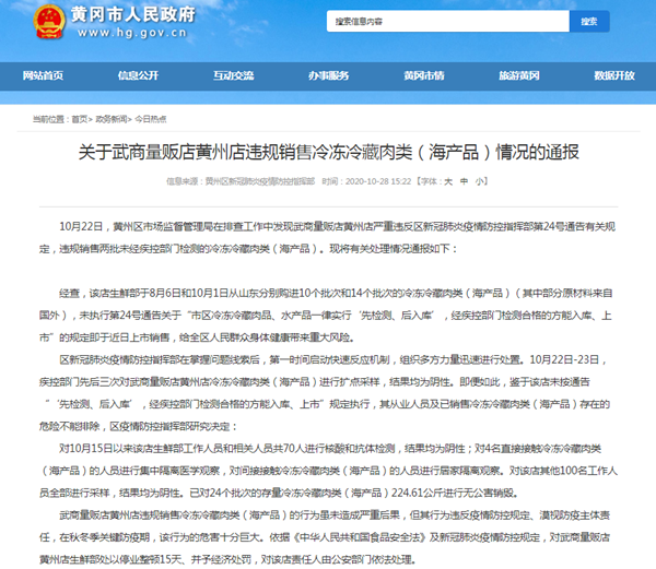10月22日,黃州區(qū)市場(chǎng)監(jiān)督管理局在排查工作中發(fā)現(xiàn)武商量販店黃州店嚴(yán)重違反區(qū)新冠肺炎疫情防控指揮部第24號(hào)通告有關(guān)規(guī)定,違規(guī)銷(xiāo)售兩批未經(jīng)疾控部門(mén)檢測(cè)的冷凍冷藏肉類(lèi)(海產(chǎn)品)。現(xiàn)將有關(guān)處理情況通報(bào)如下:
