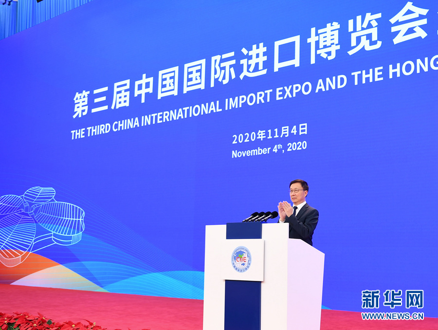 開幕式上,國家主席習(xí)近平通過視頻發(fā)表主旨演講。韓正和國務(wù)院副總理胡春華、上海市委書記李強在上海線下會場,有關(guān)國家領(lǐng)導(dǎo)人和國際組織負(fù)責(zé)人在線上會場,通過線上線下結(jié)合方式共同出席開幕式。21時25分許,韓正宣布第三屆中國國際進口博覽會開幕。