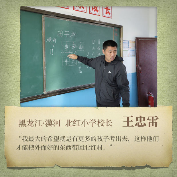 這所位于黑龍江省漠河市北極鎮北紅村的北紅小學只有兩位老師、3個年級和11名學生?!?0后”校長王忠雷每天在數學、體育、思想品德三個科目中“周旋”。打開課件,他向學生熟練講授“體積與容積”相關知識的時候,隔壁教室傳來妻子于晶的語文課上孩子們瑯瑯的讀書聲……
