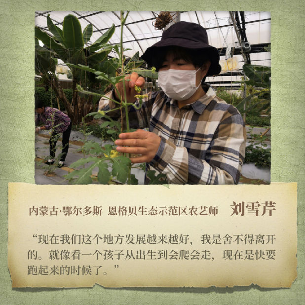 2009年初,大學畢業剛半年的劉雪芹來到恩格貝。彼時,面對有技術門檻的設施農業,當地幾乎沒有熟練工人,種植、育苗都需要劉雪芹手把手教。草業科學專業畢業的劉雪芹克服著環境、氣候等困難,同時也懂得借助自然的力量。