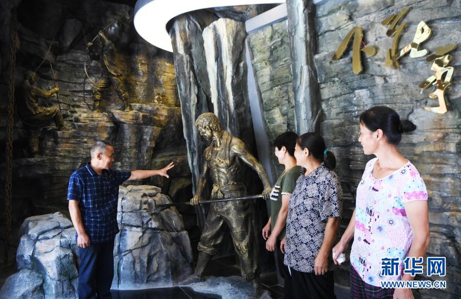 毛相林(右一)在下莊精神陳列館內(nèi)講述當(dāng)年修路的故事(2020年7月3日攝)。