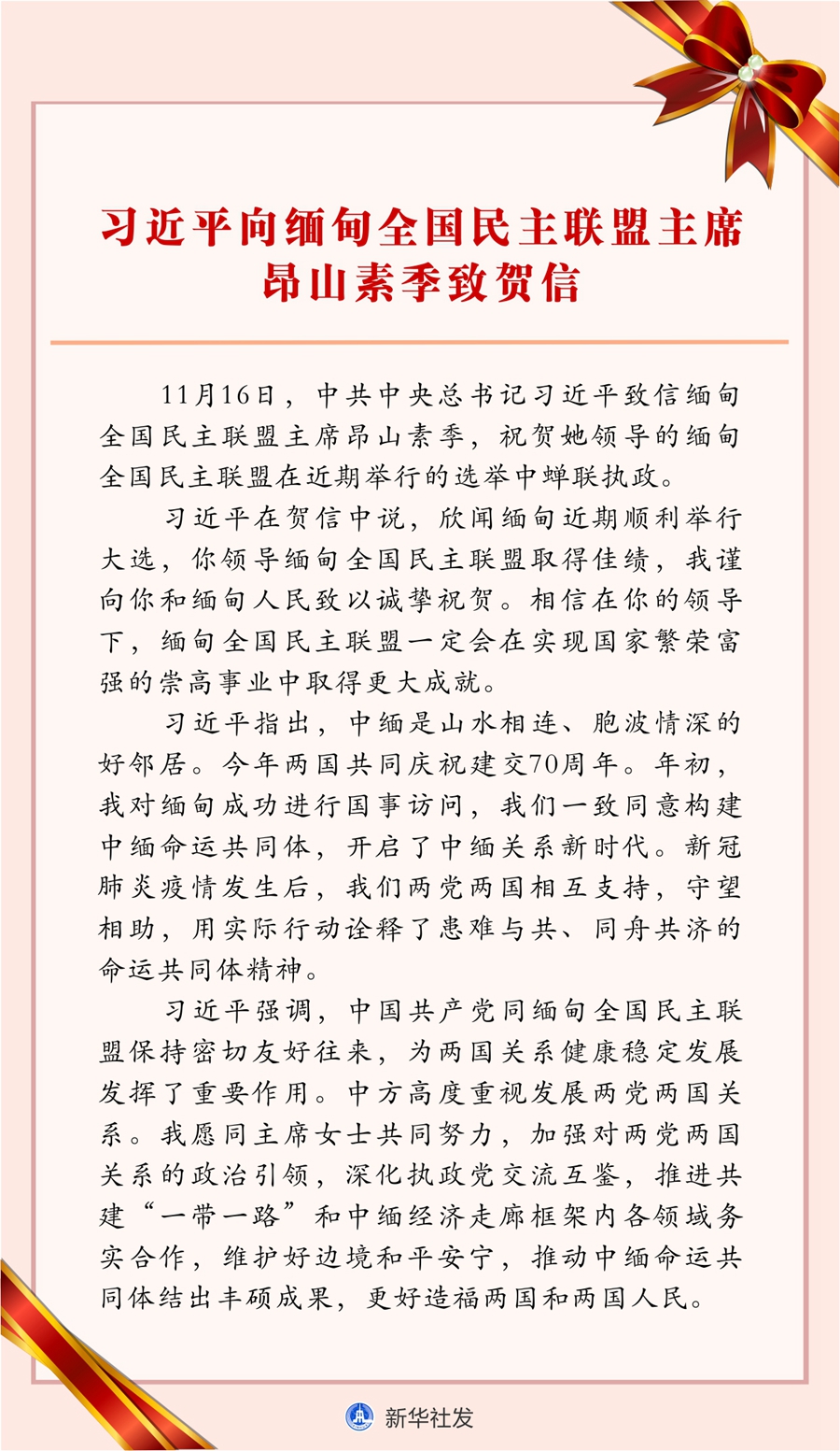 習(xí)近平在賀信中說(shuō),欣聞緬甸近期順利舉行大選,你領(lǐng)導(dǎo)緬甸全國(guó)民主聯(lián)盟取得佳績(jī),我謹(jǐn)向你和緬甸人民致以誠(chéng)摯祝賀。相信在你的領(lǐng)導(dǎo)下,緬甸全國(guó)民主聯(lián)盟一定會(huì)在實(shí)現(xiàn)國(guó)家繁榮富強(qiáng)的崇高事業(yè)中取得更大成就。
