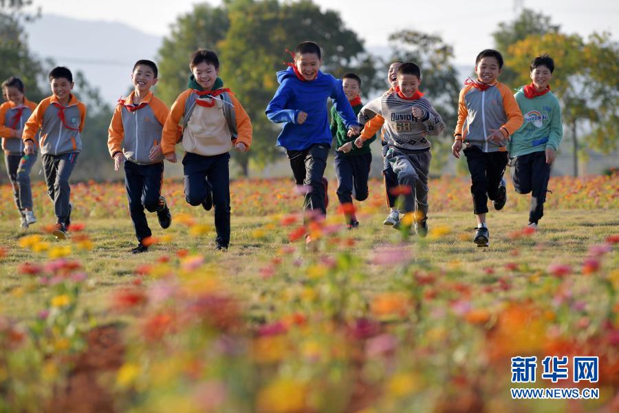 在江西省宜春市袁州區寨下中心小學,學生們在花田邊玩耍(11月9日攝)。新華社記者 彭昭之 攝