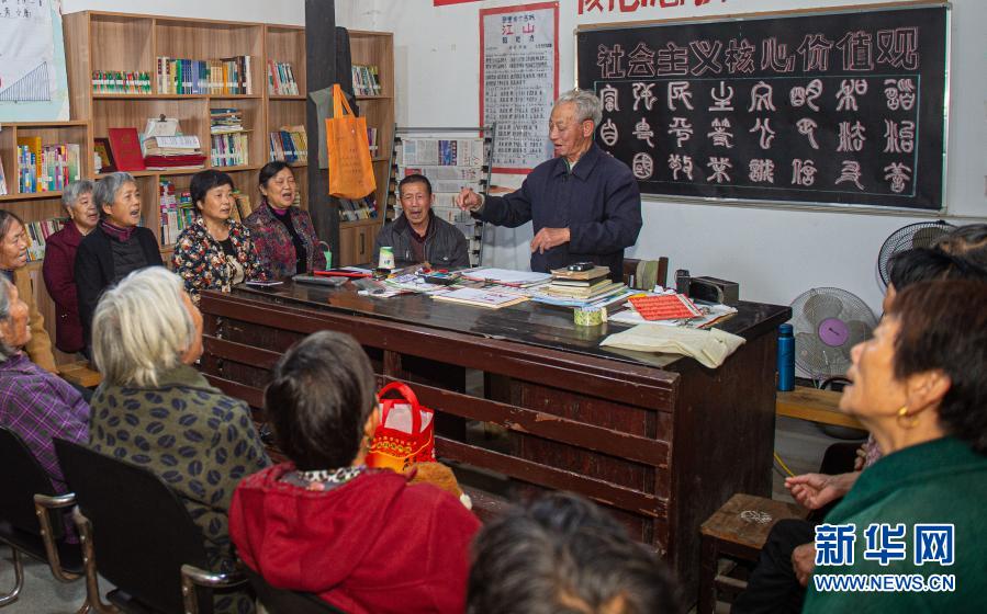 11月17日晚,大陳村村民聚在村圖書室一同唱歌。大陳村每周在圖書室組織三次歌唱活動,歌曲以自編的村歌為主。新華社發(江漢 攝)