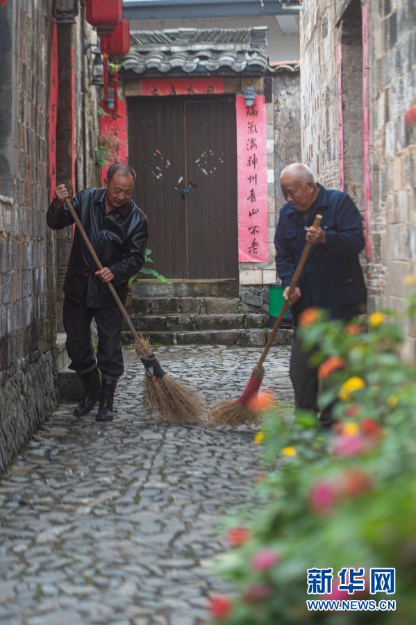 11月17日,大陳村村民汪須倉(左)、汪巖宣義務打掃村內的石板路。從2005年起,大陳村號召村民“美村必先潔家”,義務打掃也逐漸成為大家的一種習慣。新華社發(江漢 攝)