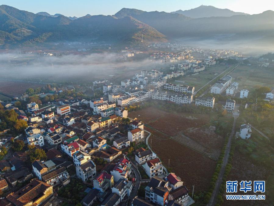 這是11月18日拍攝的沐浴在晨光中的大陳村(無人機照片)。新華社發(江漢 攝)