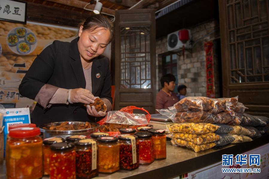 11月17日,大陳村村民汪曉玲在自家經營的土特產店內整理新鮮出爐的地瓜干供游客挑選。新華社發(江漢 攝)