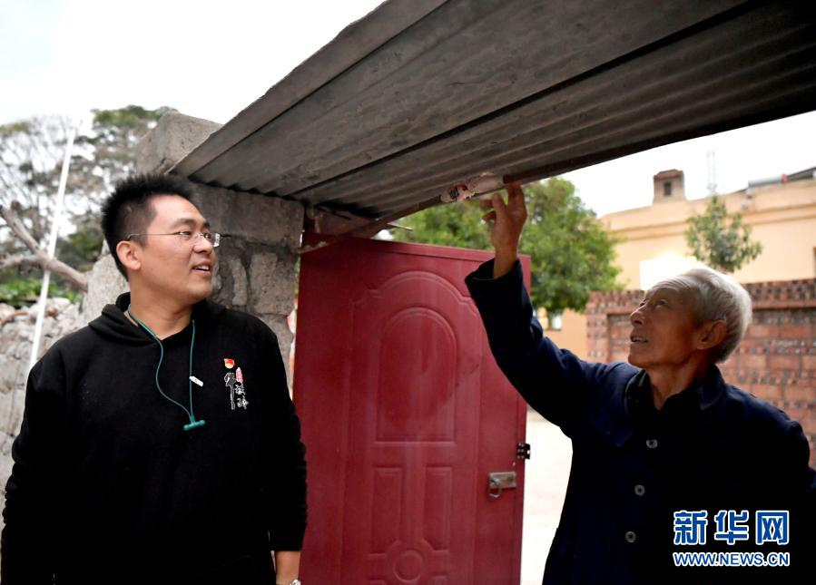 牛橫嶺村村民牛天保(右)將自家門梁掰成拱形并用布條包住,以防田昕進(jìn)門時(shí)碰到頭(10月12日攝)。新華社記者 李嘉南 攝