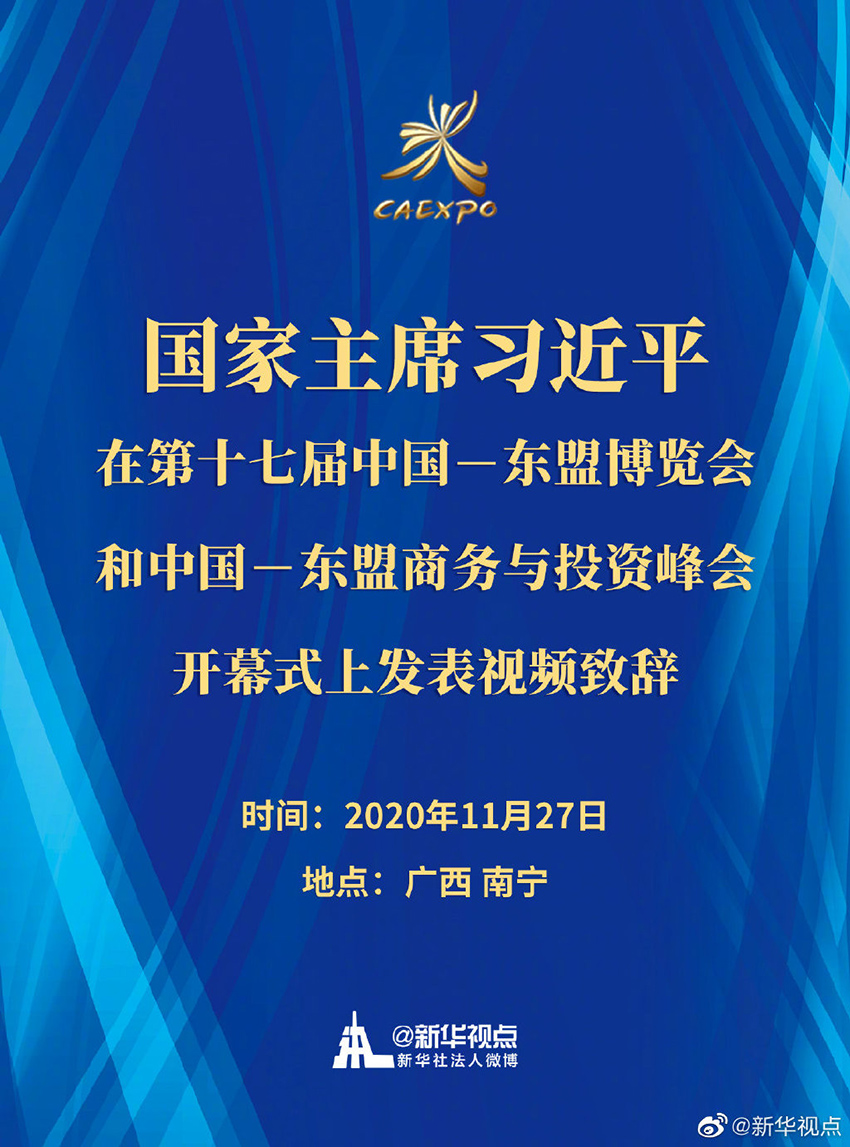 第十七屆中國(guó)-東盟博覽會(huì)和中國(guó)-東盟商務(wù)與投資峰會(huì)開(kāi)幕式11月27日在廣西南寧舉行。國(guó)家主席習(xí)近平發(fā)表視頻致辭。?