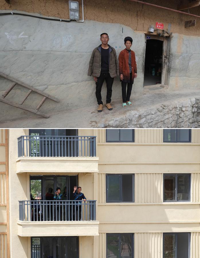 上圖為四川省昭覺縣阿土列爾村村民某色達(dá)體夫婦在“懸崖村”的家門口拍照留念(5月13日攝);下圖為某色達(dá)體夫婦在昭覺縣城易地扶貧搬遷安置點(diǎn)南坪社區(qū)新家的陽(yáng)臺(tái)上揮手(5月13日攝)。新華社記者 江宏景 攝