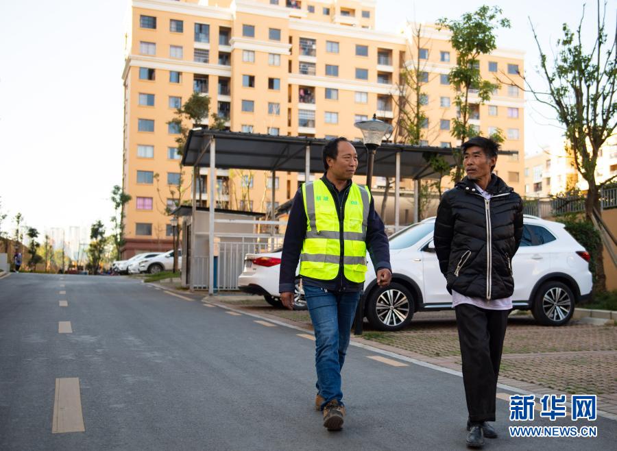 馮登友(左)在云南省鎮雄縣魯家院子易地扶貧搬遷安置點巡邏時與搬遷群眾聊天(11月10日攝)。新華社記者 王冠森 攝