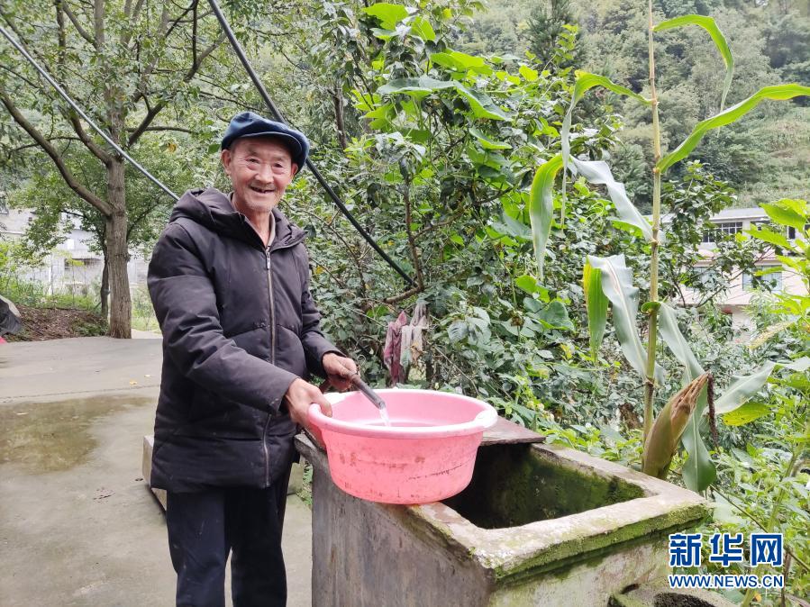 云南省鎮雄縣中屯鎮齊心村70歲的貧困戶王建春在家門口接水(9月23日攝)。新華社記者 林碧鋒 攝