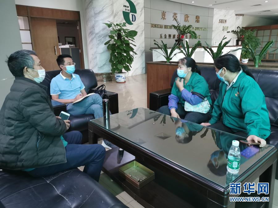 鎮雄縣駐廣東省東莞市清溪鎮勞務輸出工作站站長張勇(左二)在清溪鎮一家企業走訪鎮雄籍務工人員(4月24日攝)。新華社發