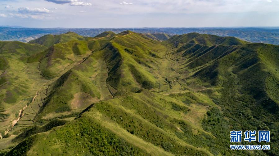 這是2018年7月16日拍攝的寧夏彭陽縣金雞坪梯田公園(無人機(jī)照片)。新華社記者 王鵬 攝
