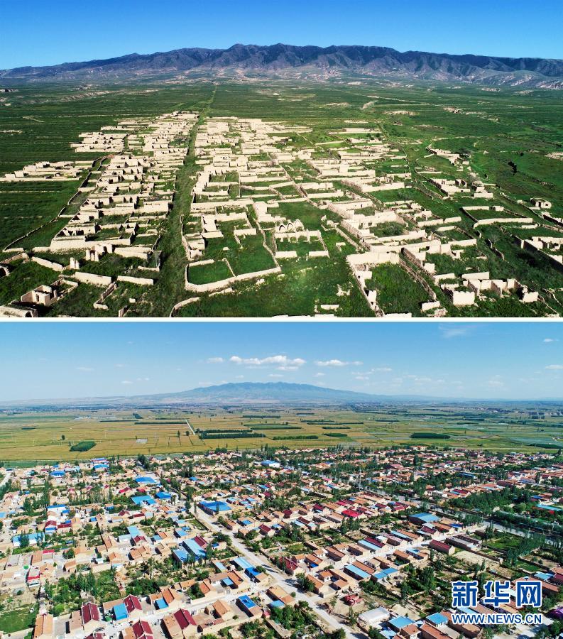 這是一張拼版照片,上圖為:經(jīng)過多年的生態(tài)修復(fù),寧夏吳忠市紅寺堡區(qū)新莊集鄉(xiāng)的移民舊址已逐漸被綠色覆蓋;下圖為:戈壁荒灘上建起的紅寺堡移民新村(2018年9月8日攝,無人機(jī)照片)。新華社記者 王鵬 攝