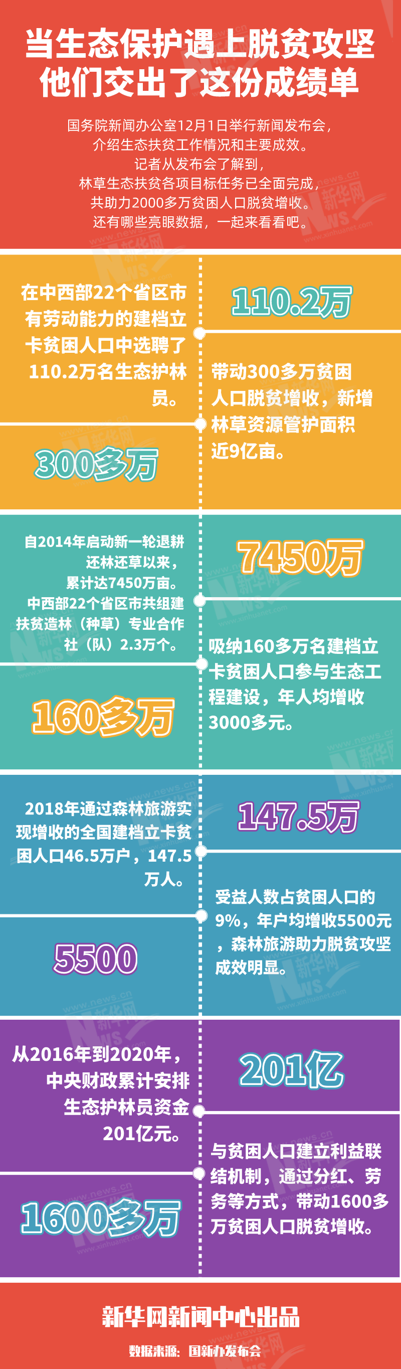 ??? 國務院新聞辦公室12月1日舉行新聞發(fā)布會,介紹生態(tài)扶貧工作情況和主要成效。記者從發(fā)布會了解到,林草生態(tài)扶貧各項目標任務已全面完成,共助力2000多萬貧困人口脫貧增收。還有哪些亮眼數據,一起來看看吧。