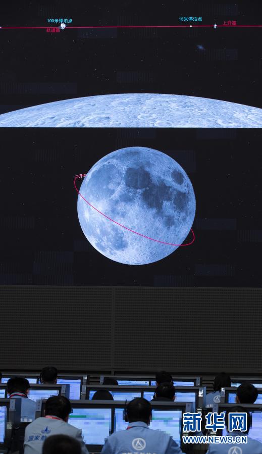 12月6日,航天科技人員在北京航天飛行控制中心指揮大廳監測嫦娥五號上升器與軌道器返回器組合體交會對接情況。