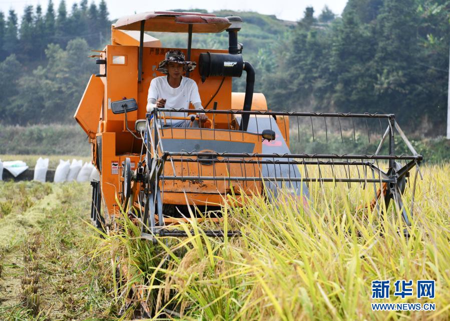 貴州省天柱縣高釀鎮(zhèn)上花村的農(nóng)民在駕駛收割機(jī)收割水稻(9月2日攝)。