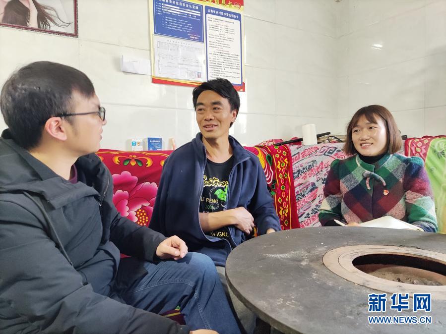 11月12日,云南省鎮雄縣以古鎮巖洞腳村駐村第一書記郭登會(右)和扶貧隊員到村民趙慶元(中)家里走訪。新華社記者 林碧鋒 攝