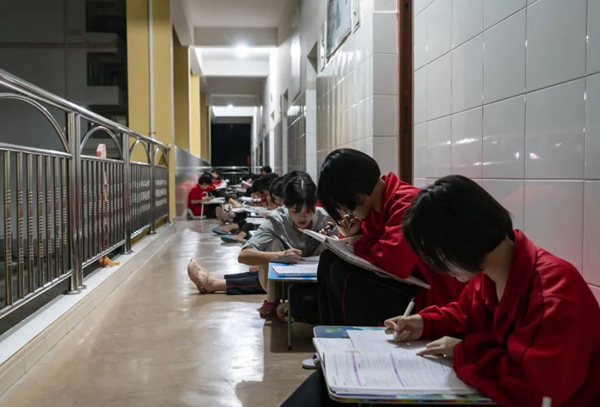 子夜時(shí)分,華坪女高的宿舍樓樓道內(nèi)燈火通明,學(xué)生在樓道里支起小桌,席地而坐,老師在樓道內(nèi)來(lái)回巡視,為學(xué)生答疑解惑。