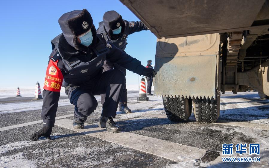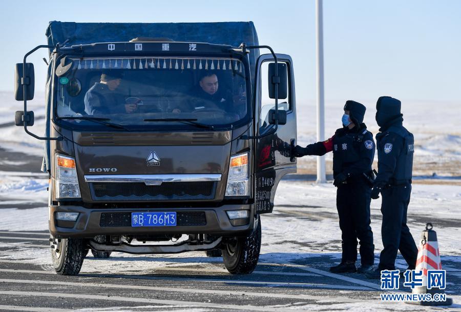 12月15日,內蒙古烏蘭察布邊境管理支隊腦木更邊境派出所民警在主著陸場區附近檢查來往車輛。新華社記者 連振 攝