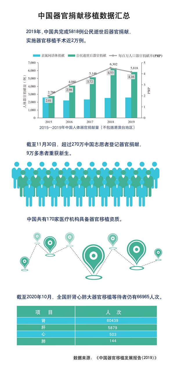——進(jìn)一步拓寬器官捐獻(xiàn)來源滿足移植需求?!爸袊鞴倬璜I(xiàn)數(shù)量和捐獻(xiàn)率雖逐年增長(zhǎng),但與國內(nèi)患者的巨大需求相比相距甚遠(yuǎn)?!蓖鹾2ㄕf,截至2020年10月,全國仍有60439人次等待腎移植、5879人次等待肝移植、503人次等待心移植、144人次等待肺移植。