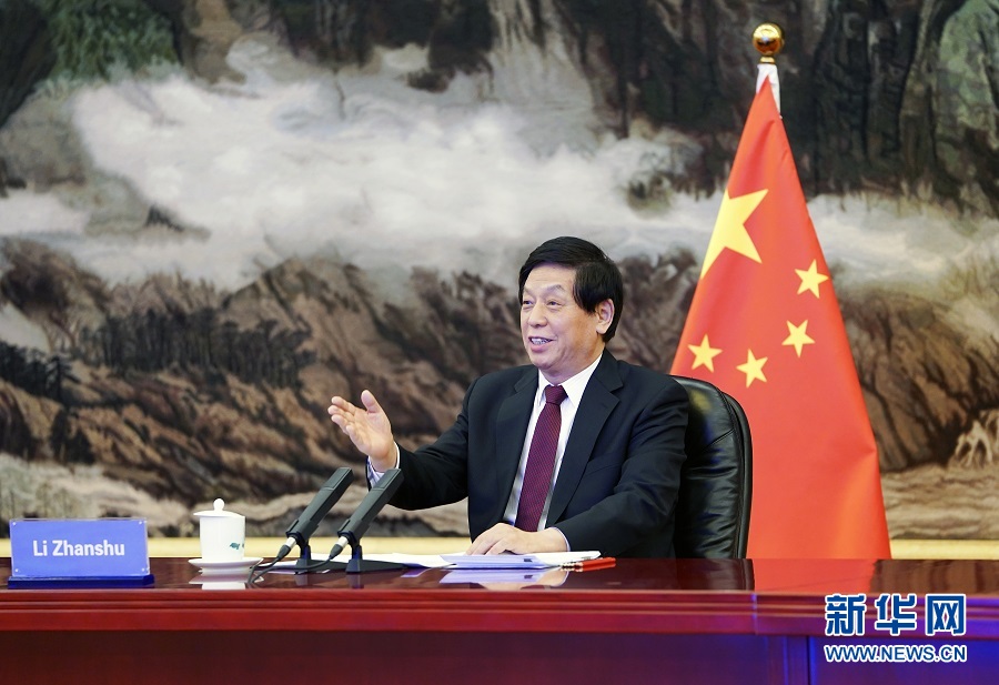 12月21日,全國(guó)人大常委會(huì)委員長(zhǎng)栗戰(zhàn)書在北京人民大會(huì)堂以視頻方式同韓國(guó)國(guó)會(huì)議長(zhǎng)樸炳錫舉行會(huì)談。新華社記者 張領(lǐng) 攝