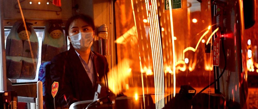 夜幕降臨之后,大街空無一人。“公交人堅(jiān)決與您在一起”的橫幅,在黑暗中閃耀。