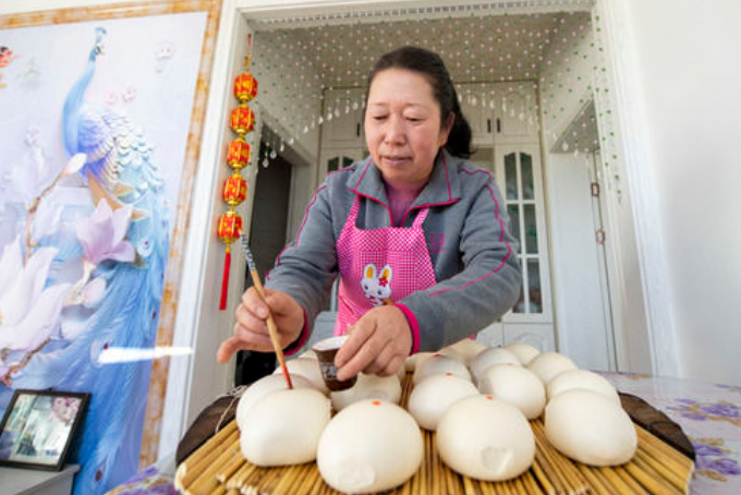 12月31日,李三花在蒸好的饅頭上點(diǎn)紅點(diǎn)。新華社記者 楊晨光 攝