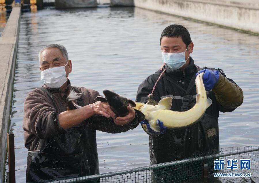 2月4日,河北省井陘縣上坡頭村綠野漁業(yè)養(yǎng)殖合作社社員展示剛捕撈的鱘魚(yú)。新華社記者 楊世堯 攝