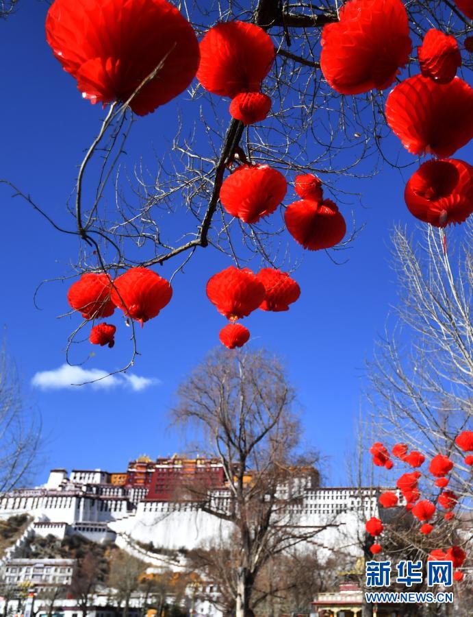 2月8日拍攝的拉薩布達(dá)拉宮前的紅燈籠。新華社記者 覺(jué)果 攝