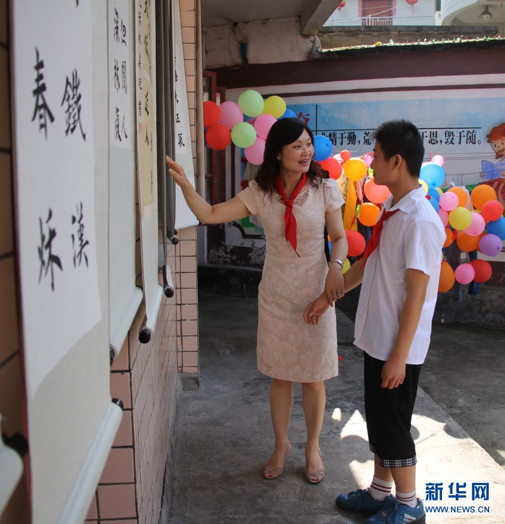 田艷(左)在貴州省印江縣特殊教育學(xué)校觀看孩子們的書畫作品(2016年6月1日攝)。新華社發(fā)