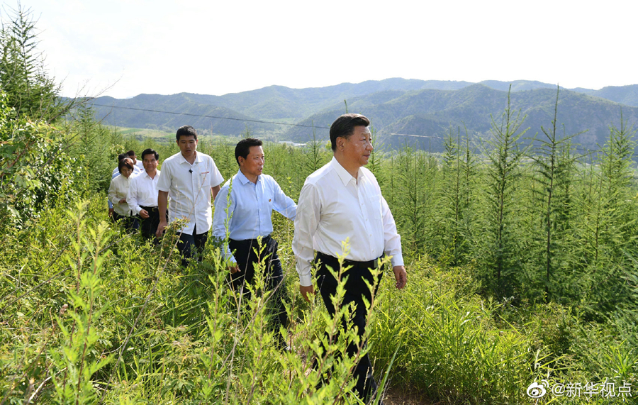 15日下午,習近平總書記來到內蒙古赤峰市喀喇沁旗馬鞍山林場考察。沿著崎嶇的護林小道,習近平步行進入林區察看林木長勢,同正在作業的護林員們親切交談,了解林場建設發展情況。大家告訴總書記,現在生態好了,在上山巡護的時候,時常碰到狍子、野兔、山雞、野豬等野生動物,來旅游的人也多了,山野菜不愁賣了,山貨也特別多,老百姓切切實實得到了好處,更加深刻地認識到綠水青山就是金山銀山。習近平對大家說:“護林員很重要,種樹多不容易啊!建設祖國北方和首都生態安全屏障是戰略性的任務,是我們要世世代代做下去的事情。”